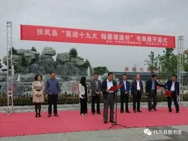 在举国上下喜迎党的十九大,欢庆国庆暨中秋佳节来临之际,9月29日上午,由中共扶风县委宣传部、扶风县文广局主办,扶风县图书馆、文化馆、县书法家协会承办的“喜迎十九大、欢度国庆节书画展”在丹桂飘香、毓秀美丽、风景如画的国家湿地公园七星河畔隆重开幕。参加这次书画展开幕式的领导有扶风县委副书记张扬,县委常委、县委宣传部部长刘新龙,县人大常委会副主任张宏礼、张莉萍,县政协副主席颜琼峰等。县委宣传部、县文广局、文化馆、图书馆、县书协负责同志和该县书法家协会会员200余人参加开幕式。