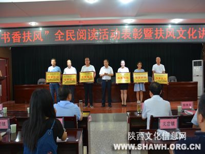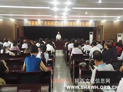2019年7月9日,“书香扶风“全民阅读活动表彰暨扶风文化讲座在扶风县公安局七楼会议室举行。参加这次阅读表彰暨扶风文化讲座活动的有县各镇街、县级有关部门、单位主管文化工作的负责人、受表彰的先进单位、学校、家庭、个人和各社会团体会员200余人。县委常委、宣传部长刘新龙,副县长郭小军,县文化和旅游局局长王春让,县委宣传部副部长、文明办主任、文联、社科联主席杨林生等出席了活动。