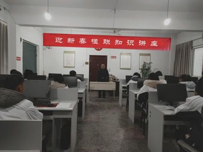 此次特别邀请的是中国楹联学会会员、中国楹联书法艺术委员会委员,陕西省楹联学会常务理事,宝鸡市楹联学会第一、二、三届副会长,扶风县诗词楹联学会副会长翟功印先生,翟老师从楹联知识和春联故事两个方面为县郡智技校的40名学生做了深入浅出,详实有趣的讲解,不仅普及了楹联知识,增强了学生对春联的认识,同时也丰富了学生们的课余文化生活,这次讲座不仅加深了同学们对楹联文化的了解,更激发了他们创作楹联的兴趣,有助于丰富学生的精神生活,提高学生的综合素质。