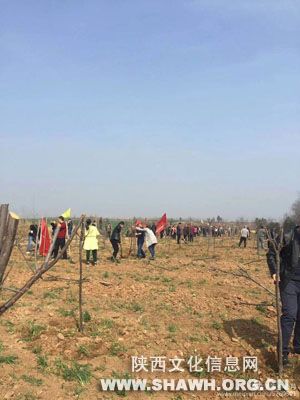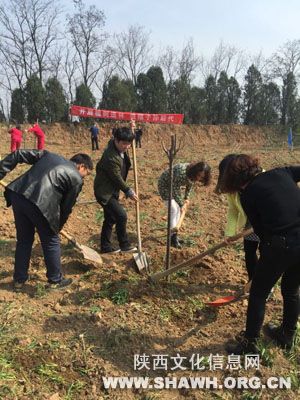 下午两点,扶风县图书馆职工在杨馆长带领下早早来到降帐古水村北坡塬顶,劳动现场,人头攒动,大家个个干劲十足,热情高涨,兴致勃勃地投入到播种绿色的行动中。有的扶苗,有的培土,道道工序做得认真细致,干得热火朝天、十分起劲,到处都是忙碌的身影和劳动的欢声笑语。经过大家2个多小时的努力,一棵棵新栽的苗木迎风挺立,给古水村又增添了一道绿色风景线。