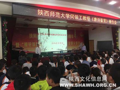 在第三十届图书馆服务宣传周活动之际,为培养学生的古诗词的诵读兴趣,鉴赏能力。扶风县图书馆特邀陕西师范大学文学院的何依工副教授走进扶风高中,给高一800余名师生做《唐诗鉴赏》报告会。